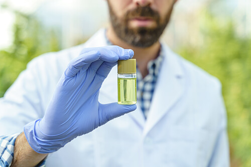 Caption:Bearded male specialist in white robe and gloves demonstrating bottle with cannabis medicine while standing in greenhouse