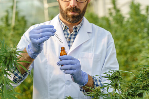 14157775 Side view of crop focused male specialist in uniform and gloves standing near hemp bushes in hothouse and holding bottle with cannabis extract while working in pharmaceutical laboratory