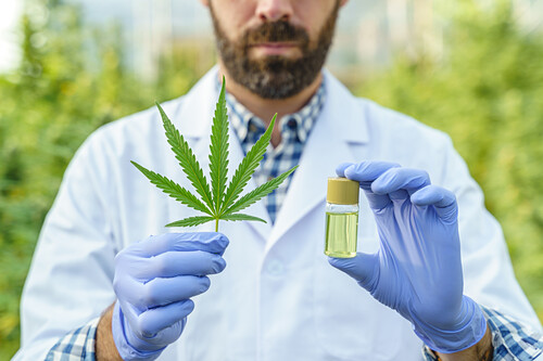 Caption:Crop bearded male specialist in white robe and gloves demonstrating bottle with cannabis medicine and green hemp leaf while standing in greenhouse