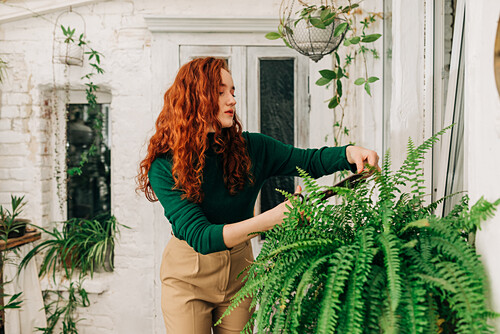 Caption:Serious female with ginger hair trimming green branch of potted fern growing in indoor garden