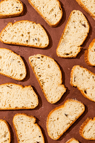 Top view of several slices of artisan bread arranged on a rustic wooden surface. The bread has a golden crust and an airy interior, ideal for culinary themes