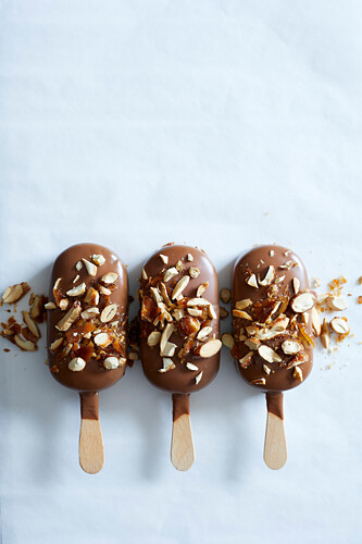 Caption:Three almond ice cream sticks covered in milk chocolate, sprinkled with roasted almonds on a white marble background